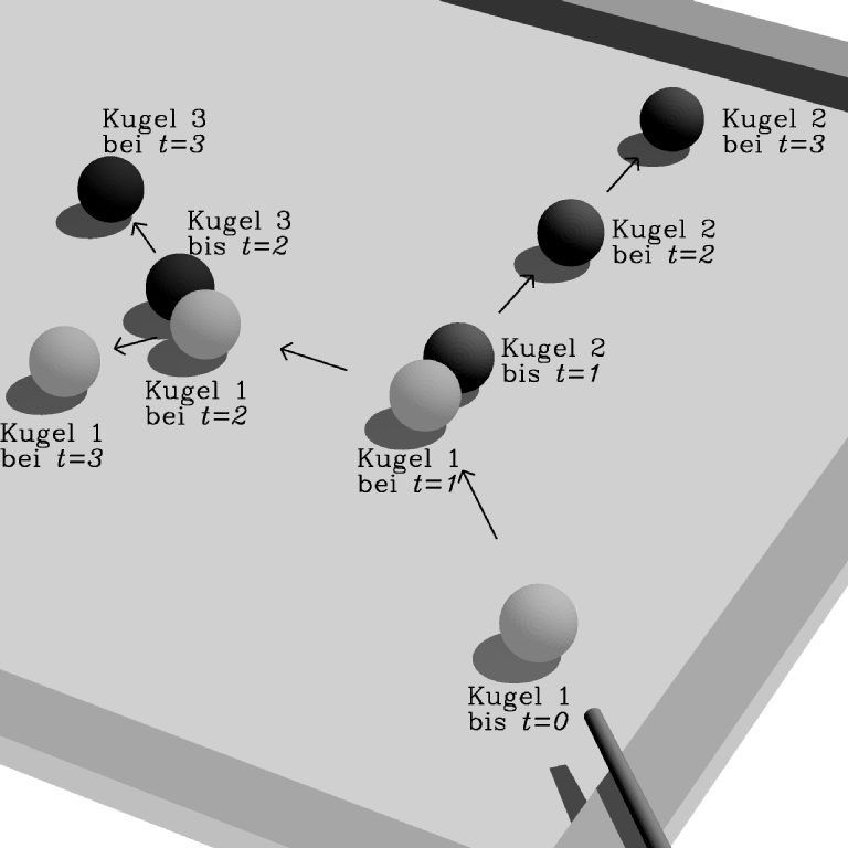 Positionen von Billardbällen zu vier äquidistanten Zeitpunkten und die Entfaltung in einRaum-Zeit-Diagramm
